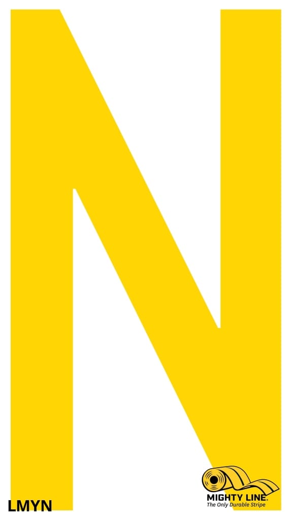 Yellow Mighty Line Floor Tape N, 4.5”x10', pack of 10. These letters and numbers are powerful floor marking tool. The low profile and 20 MIL thickness of the adhesive floor shape helps to withstand industrial traffic. The letters and numbers do not leave residue upon removal. These T shapes help to keep inventory, tools, and workers organized while allowing for constant industrial traffic. This product comes in a pack of 10.