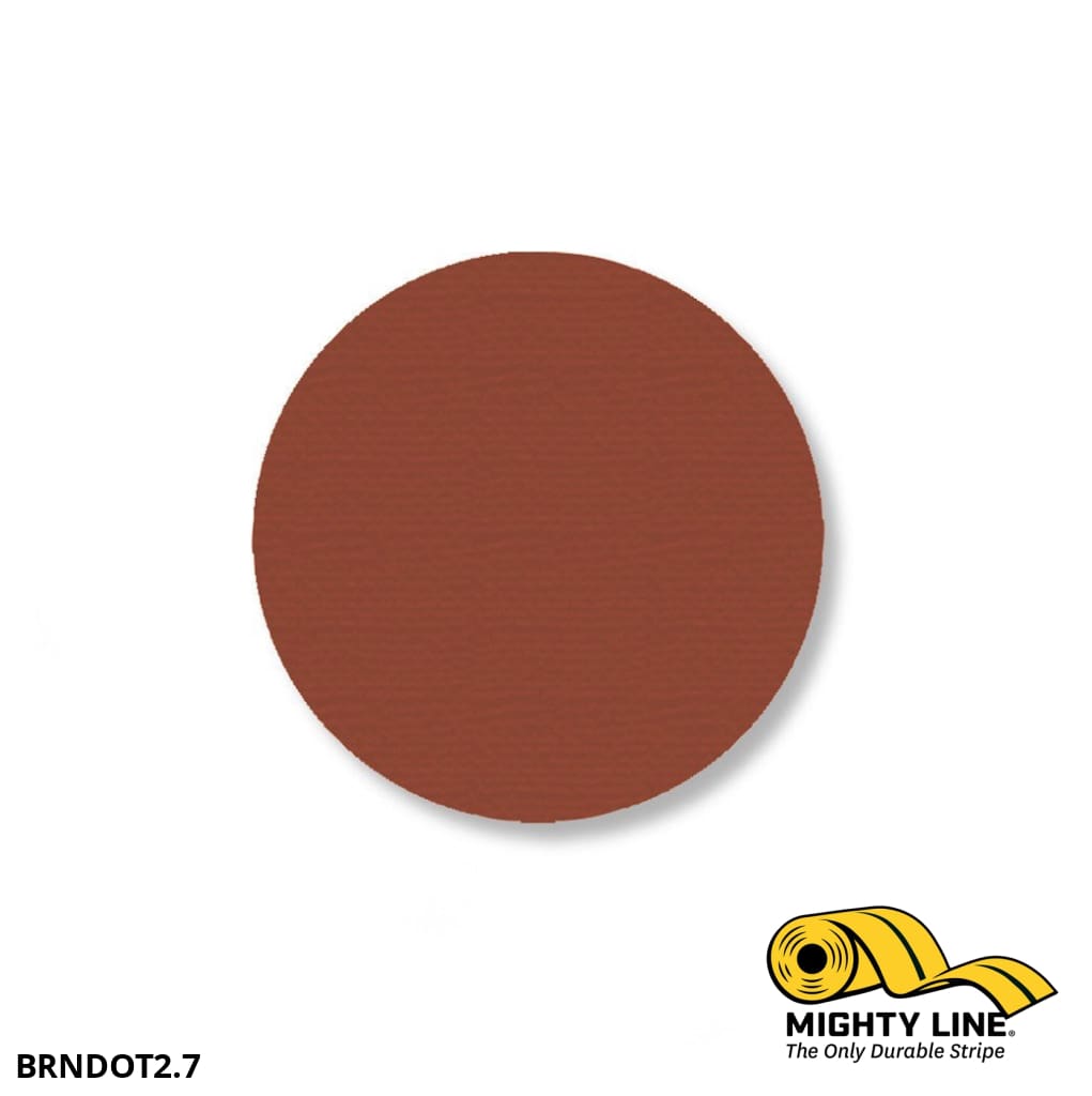Patented Mighty Line Floor Marking Brown 2.7 inch wide dots. Mighty Line dots are great for marking busy aisle ways or loading dock aisles. Peel and stick Mighty Line dots are great for 5s environments. Place a Mighty Line dot every few feet down your aisle or exit way. Part Number: BRNDOT2.7 UPC:815035012269